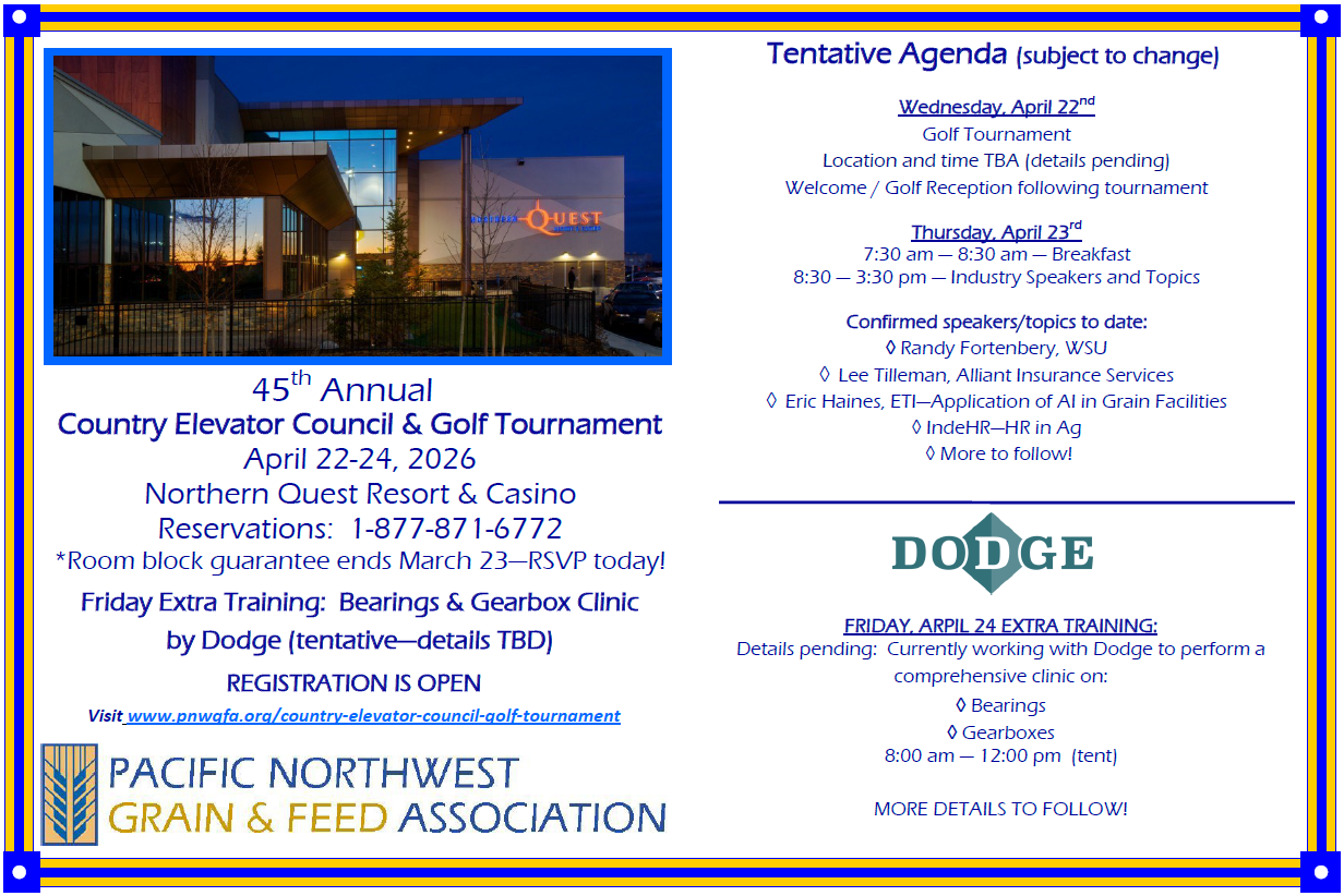 ♦♦NEXT UP:108th Annual Convention & Golf Tournaments - June 14-16 at Campbell's Resort in Chelan, WA:Registration will open in March - stay tuned!♦♦The PNWGFA Annual Directory has been published. All members receive one complimentary copy annually (advertisers also receive a copy). Contact Margerie to purchase a new 2026 edition.Visit the Directory page for more information.♦♦PNWGFA's 2026 Scholarship Application IS OPEN! Deadline for applications is April 7. Please share this information with students in your communities!♦♦**Be sure to visit the Events page for 2026 dates and beyond!**---------------------------------Recently Completed Events:February 11-13, 2026 - 58th Annual Warehousemen's Conference & Trade Show recently concluded.October 22-23, 2025 - PNWGFA Maintenance & Safety Workshop concluded.September 25, 2025 - Idaho Trout Fry concluded.June 17-19, 2025 - Annual ConventionApril 23-25, 2025 - Country Elevator CouncilSPECIAL MEMBER EVENT: April 7-9, 2025 - PNWGFA/WMC Wheat Quality Workshop (note: this event will not be held next year). AGENDA---------------------------------Congratulations to our 2025 Scholarship Award winners!